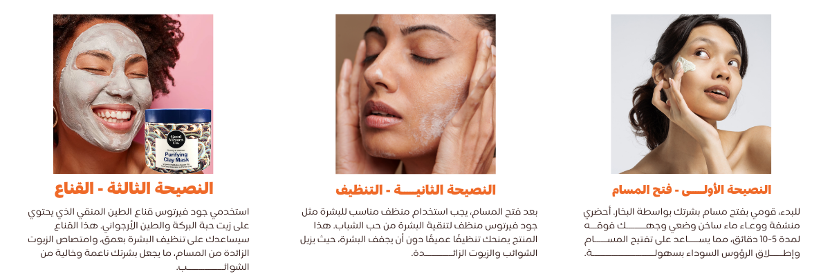 استخدام مقشر لطيف مثل جود فيرتوس مقشر الوجه سيساعدك على إزالة خلايا الجلد الميتة، مما يمنع تراكمها وانسداد المسام. يمكنك تقشير البشرة مرتين أسبوعيًا للحصول على نتائج مثالية.